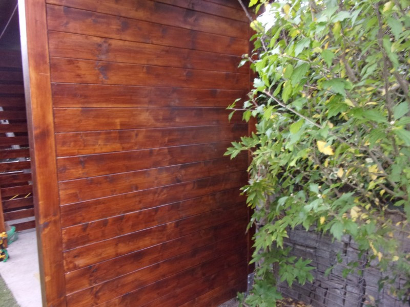 Rozměry přístřešku jsme přizpůsobili požadavku zákazníka. Na výrobu jsme použili dokonale hoblované smrkové hranoly (9×9 cm, 9×4 cm, 4×4 cm) a prkna. Povrch jsme ošetřili impregnací a lazurou Xyladecor v elegantním odstínu lískový ořech, která dřevu dodává dlouhou životnost a teplý přirozený tón.