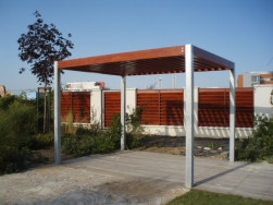 Pro inspiraci přikládáme fotografie moderních pergol vyrobených naší firmou na zakázku. Jednou z nich byla pergola s dřevěnou konstrukcí a zábradlím zbudovaná na střeše garáže. Zákazníkovým přáním bylo podobně jako ve vašem případě zbudovat moderně působící pergolu. Toho bylo dosaženo pomocí silných vrstev nátěrů na dřevěnou konstrukci, jejíž jednotlivé trámy byly opatřeny dekorativními rýhami. V souladu se vzhledem konstrukce bylo i zábradlí opatřeno silnou vrstvou nátěru, který překryl původní kresbu dřeva. Navíc bylo zábradlí vytvarováno do zajímavého designu, který celkový efekt moderní pergoly ještě posílil. Kromě této moderní dřevěné pergoly jsme pro jiného klienta zhotovili pergolu s kovovou konstrukcí, která se použitým materiálem i svým vzezřením rovněž vymykala tradičním dřevěným pergolám, které pro naše zákazníky běžně vyrábíme.