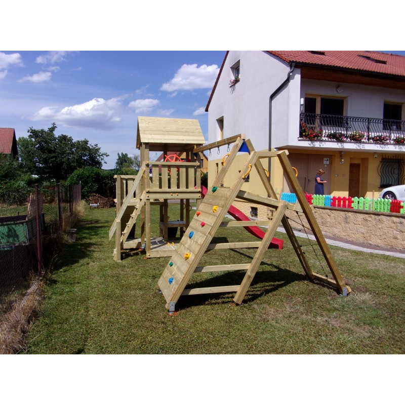 Dětské hřiště dodáváme v rozloženém stavu s návodem na montáž. Je možné jej rozšířit o další moduly, například na houpání nebo lezení, nebo propojit jednotlivé věže můstkem...