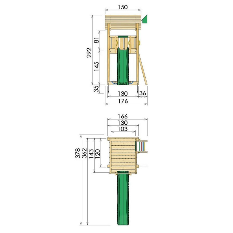 Jako každá hrací sestava této řady je Shelter opatřen skluzavkou, u které je možno vybírat barvu. Barvu si prosím vyberte z nabídky. Na hřiště se připojuje skluzavka o délce 2,65 m s jednou vlnou pro co možná největší zábavu a její nástupní výška je 145 cm.