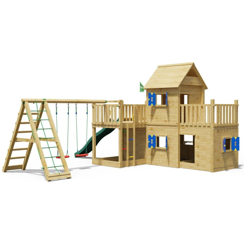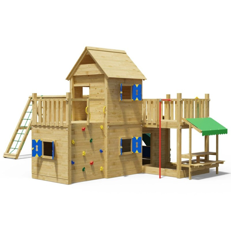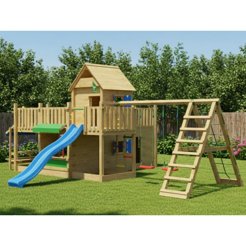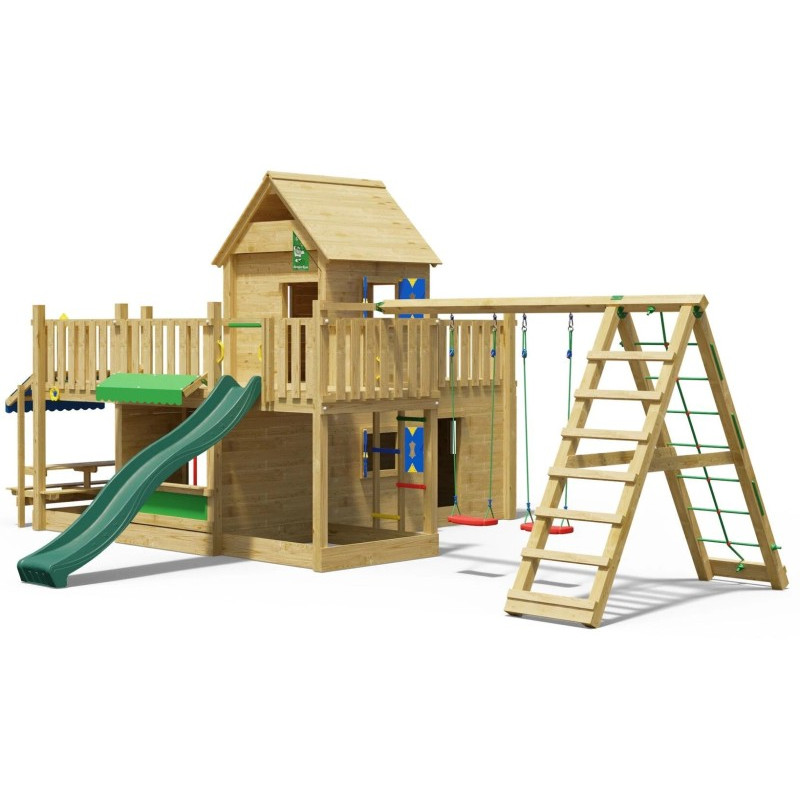 Chci individuální nabídkuDětské hřiště Hotel patří k velkým hracím sestavám Jungle Gym. Dvě herní věže vyrobené z hranolů o průřezu 9 x 9 cm jsou spojeny pevným mostem. Obě věže jsou kryty odolnou dřevěnou stříškou. Ve spodní části pod podestou je krytý prostor - domeček s okny a okenicemi, kde si děti mohou po sjetí barevné skluzavky užít spoustu zábavy. Podesta pro skluzavku je ve výšce 145 cm.