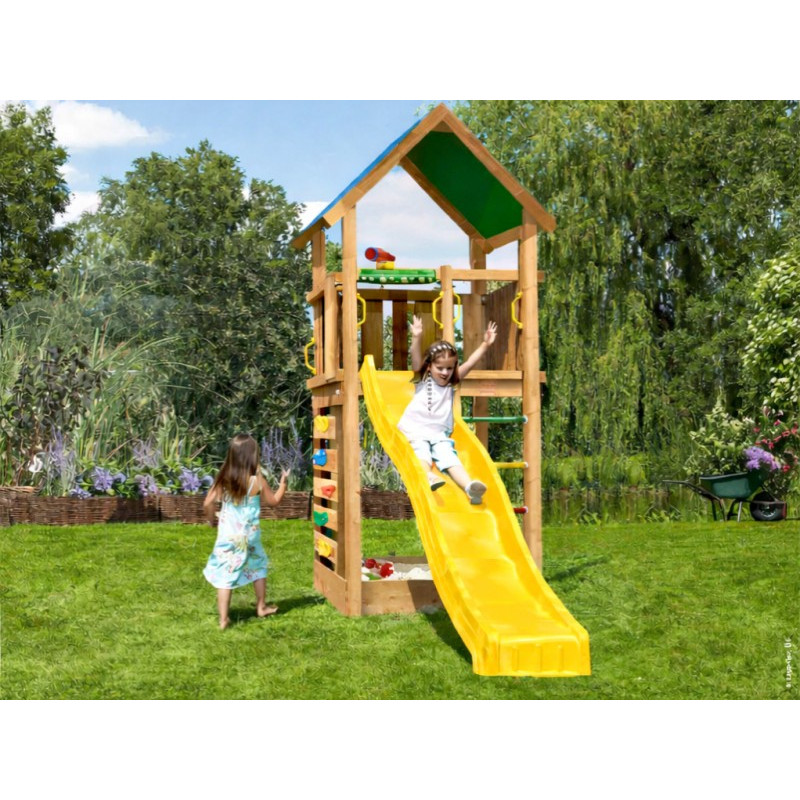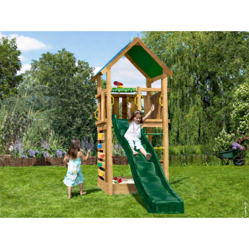 Chci individuální nabídkuDětské hřiště Lodge vyrobené z hranolů 9 x 9 cm patří k středně velkým herním sestavám Jungle Gym. Herní věž je jednopodlažní, krytá odolnou plátěnou stříškou. Ve spodní části věže se nachází pískoviště, kde si děti mohou po sjetí dlouhé skluzavky užít spoustu zábavy. Na věž se dá vylézt dvěma způsoby. Jedním z nich je naklopený žebřík s barevnými stupni, druhým je barevný provazový žebřík.
