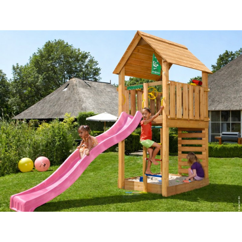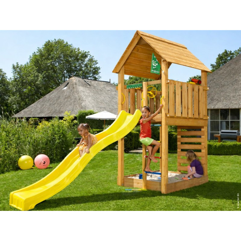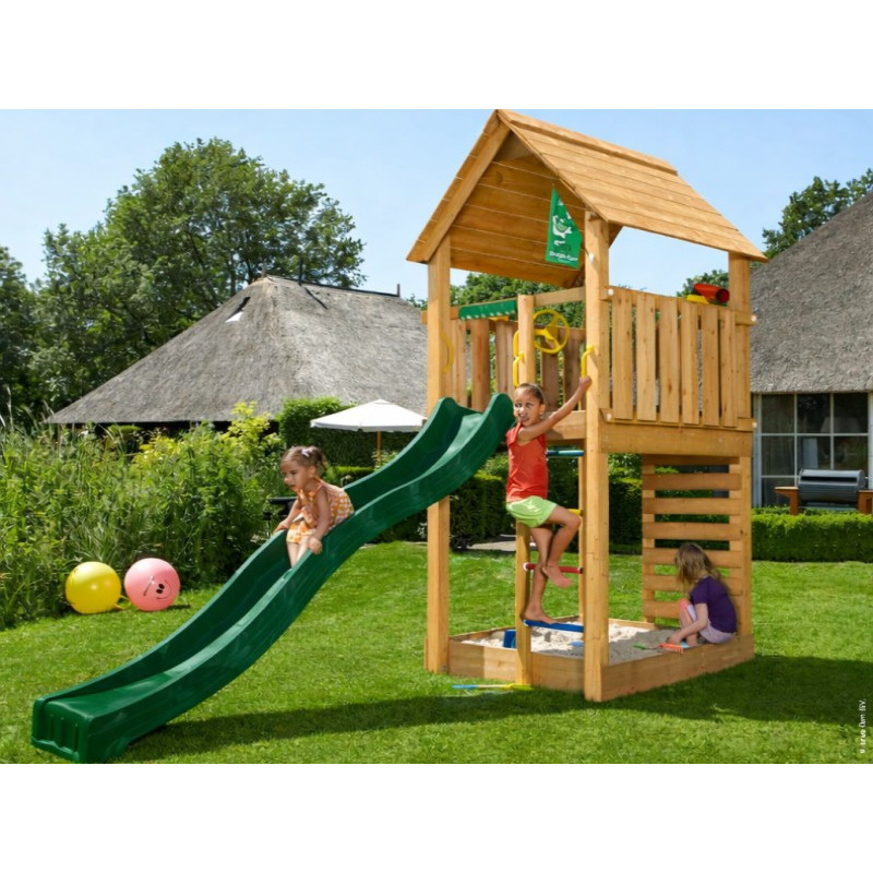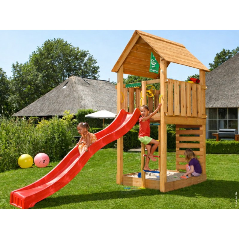 Jako každá hrací sestava této řady je Cabin opatřen skluzavkou, u které je možno vybírat barvu. Barvu si prosím vyberte z nabídky. Na hřiště se připojuje skluzavka o délce 2,65 m s jednou vlnou pro co možná největší zábavu a její nástupní výška je 145 cm.