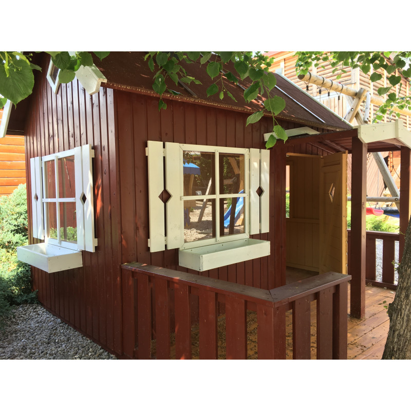 Aby měly děti přehled, co se děje okolo nich, má domek Otto dokonce tři okna! Jedno v levé a pravé straně a jedno směrem do verandy. Díky tomu budou mít děti uvnitř dostatek světla na hraní, aniž by si zbytečně namáhaly oči, ale zároveň je bez vyrušení budete moci nenápadně hlídat. Všechna okna jsou zasklena plexisklem a tak nehrozí, že by se mohlo rozbít a děti pořezat, pro jistotu jsou navíc vyztužena dřevěnými latěmi. Všechna prkna, ze kterých je domek složen jsou do hladka ohoblována a nehrozí tak vražení třísky. Všechny stěny přichází předmontovány v panelech a nemusíte se tak bát, že byste například zvolením špatného spojovacího materiálu mohli Vaše dítě ohrozit.
