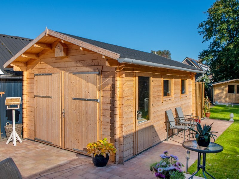 Na konstrukci dřevěné garáže je použit dokonale vysušený severský smrk. Jednotlivá prkna, palubky a sloupky jsou přesně nakrácené na požadovanou délku a dohladka ohoblované. Síla prken dřevěné garáže je 44 mm. Spoje v rozích garáže jsou řešeny spolehlivými zámky, které do sebe přesně zapadají a tvoří pevný, ale rozebíratelný spoj. Dřevo není ošetřeno žádnou impregnací ani nátěrem, je ale možné za příplatek nátěr provést v naší lakovně spolehlivými lazurami na dřevo Xyladecor.