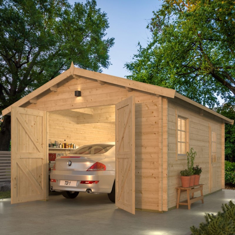 Na konstrukci dřevěné garáže je použit dokonale vysušený severský smrk. Jednotlivá prkna, palubky a sloupky jsou přesně nakrácené na požadovanou délku a dohladka ohoblované. Síla prken dřevěné garáže je 58 mm. Spoje v rozích garáže jsou řešeny spolehlivými zámky, které do sebe přesně zapadají a tvoří pevný, avšak rozebíratelný spoj. Dřevo není ošetřeno žádnou impregnací ani nátěrem, je ale možné za příplatek nátěr provést v naší lakovně spolehlivými lazurami na dřevo Xyladecor.