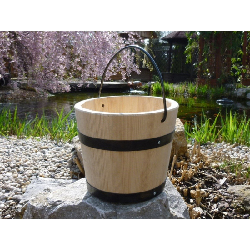 Dřevěné vědro s pevným dnem ke studni nebo doplněk do zahrady. Je možné také použít jako obal na květináč, nebo vyvrtat do dna otvor a osázet květinami. Vnější rozměry jsou průměr 25cm a výška 22cm, vnitřní průměr je 22cm a výška 19cm. Vyrobeno ze smrkového dřeva, staženo kovovými obručemi v černé barvě, součástí je kovové ucho na nošení nebo zavěšení. Standardně dodáváno bez povrchové úpravy (nátěru).