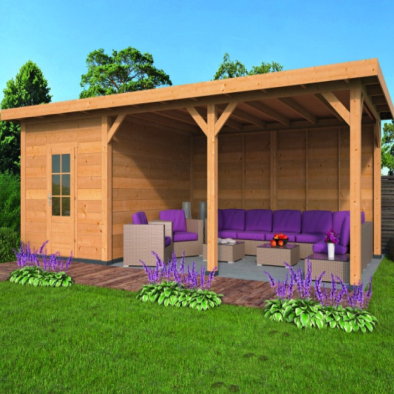 Chci individuální nabídkuGarážové stání s přístavkem Twello je prostorné garážové stání z modřínového dřeva s plochou střechou a rozměry 743 x 370 cm. Je skvěle využitelné nejen na parkování Vašeho vozu, ale i na letní posezení u grilu, nebo jako přístřešek na uskladnění či zahradního nářadí. Ze tří stran je stání kryto proti větru stěnou z modřínových prken, které mohou být buď z přírodního modřínu, nebo v černé barvě. Zároveň je velmi praktické díky tomu, že k němu patří jedna samostatná místnost. Vedou do ní jednokřídlé prosklené dveře, kterými dovnitř proniká světlo.