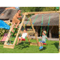 Dřevěná konstrukce umožňuje zavěšení dvou houpaček, nebo jiného závěsného prvku. Šplhací síť s naproti stojícím žebříkem zajišťují perfektní stabilitu celé konstrukce.
