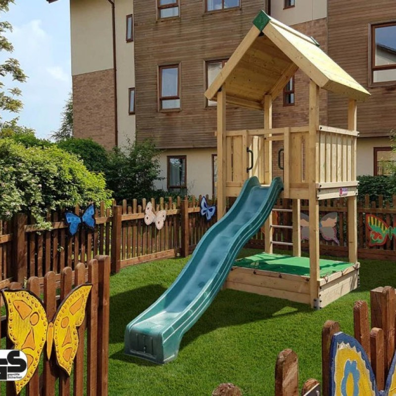 Věž se stříškou a skluzavkou. Dětské hřiště Hy Land 2 je určeno pro menší zastavěné plochy a patří k nejmenším typům dětských hřišť pro veřejná prostranství. Je vyrobeno z hladce opracovaného impregnovaného jehličnatého dřeva, je vybavenou certifikovanou skluzavkou a veškerým potřebným kotvicím materiálem.
