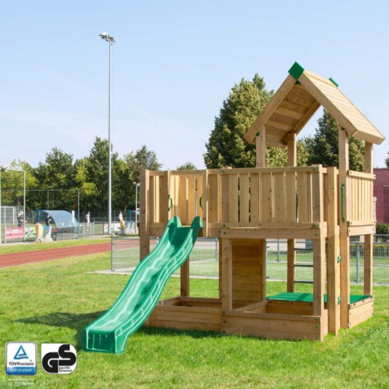 Věž s velkou podestou, se stříškou a skluzavkou. Dětské hřiště Hy Land 5 je určeno pro velké zastavěné plochy a patří k středně velkým typům dětských hřišť pro veřejná prostranství. Je vyrobeno z hladce opracovaného impregnovaného jehličnatého dřeva, je vybavenou certifikovanou skluzavkou a veškerým potřebným kotvicím materiálem.