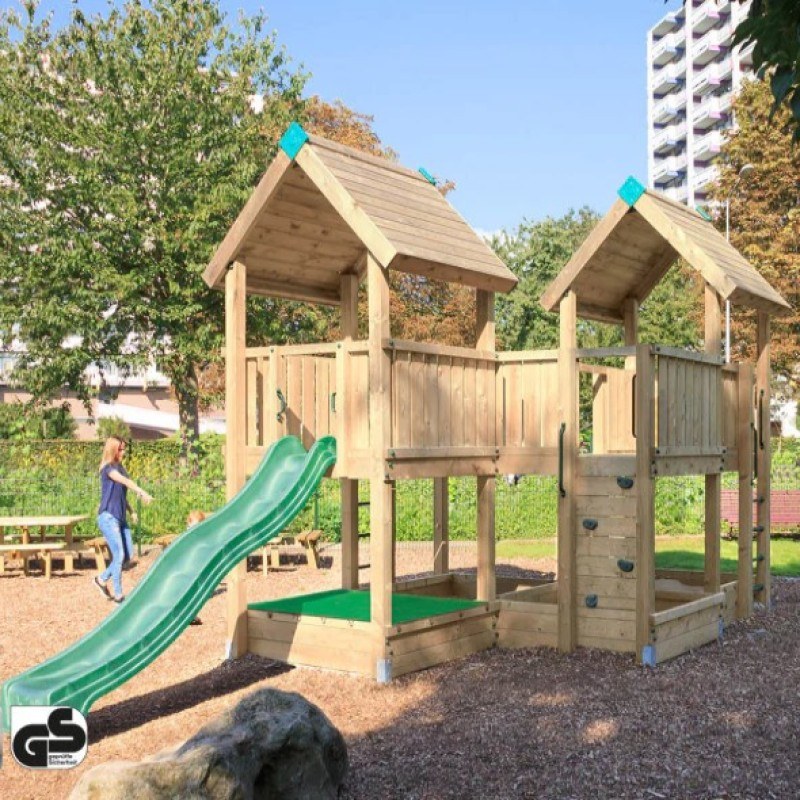 Spojení dvou věží se stříškou, dvěma žebříky a dvěma horolezeckými stěnami. Dětské hřiště Hy Land 6 je určeno pro větší zastavěné plochy a patří k středně velkým typům dětských hřišť pro veřejná prostranství. Je vyrobeno z hladce opracovaného impregnovaného jehličnatého dřeva, je vybavenou certifikovanou skluzavkou a veškerým potřebným kotvicím materiálem.