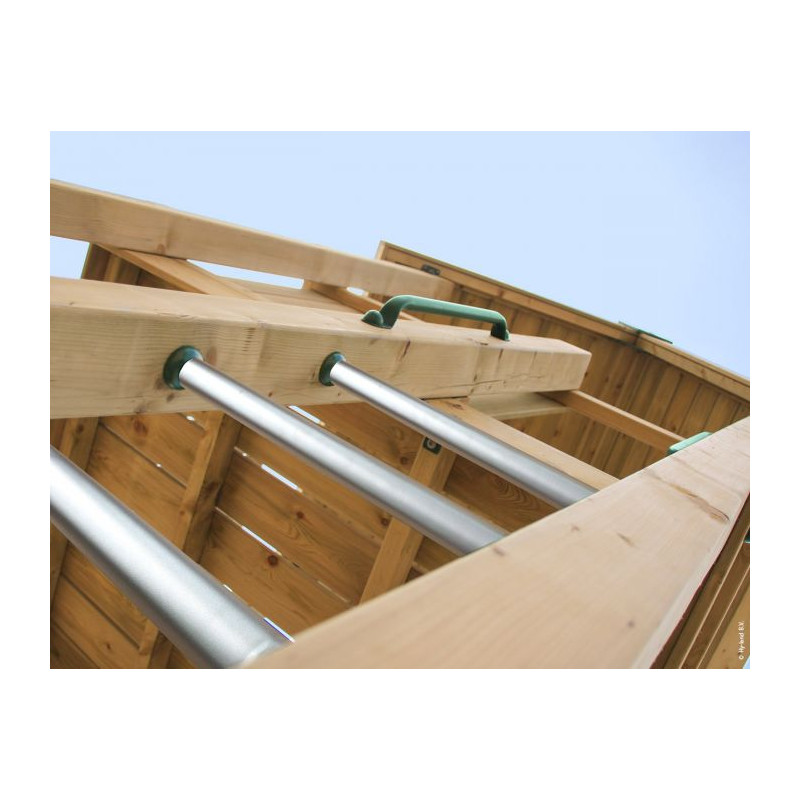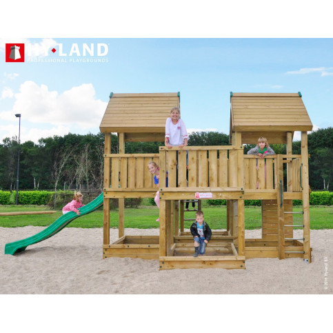 Spojení dvou věží se stříškou, žebříkem a třemi horolezeckými stěnami. Dětské hřiště Hy Land 7 je určeno pro větší zastavěné plochy a patří k středně velkým typům dětských hřišť pro veřejná prostranství. Je vyrobeno z hladce opracovaného impregnovaného jehličnatého dřeva, je vybavenou certifikovanou skluzavkou a veškerým potřebným kotvicím materiálem. Kromě skluzavky a prolézaček jsou pod hřištěm také dvě pískoviště, které děti zabaví na celý den.