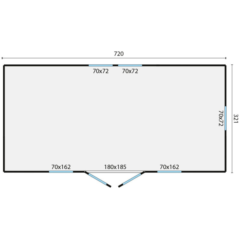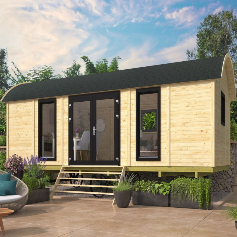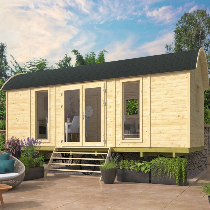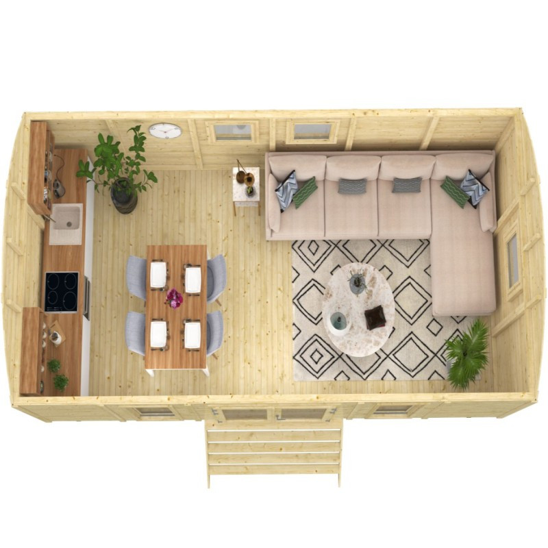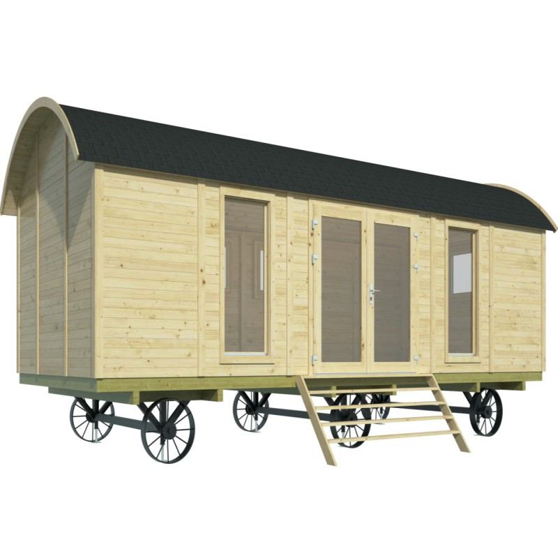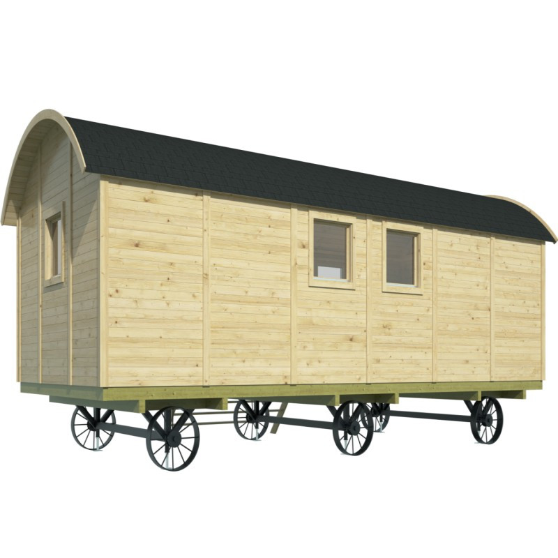 Chci individuální nabídkuMaringotka Dan je stylová dřevostavba s rozměry 720 x 328 cm. Maringotka má velmi prostornou obytnou místnost a vstup dvoukřídlými dveřmi 180 x 185 cm. Po stranách dveří jsou prosklená neotevíratelná okna o rozměru 70 x 162 cm. Další tři okna 70 x 72 cm v protilehlých stranách se dají otevřít. Okna i dveře jsou zaskleny izolačním dvojsklem 3-6-3 mm. Maringotka se dá používat pouze jako stacionární domek a v základu je dodávána s podlahou a montážní sadou, bez železných kol a podpěr.