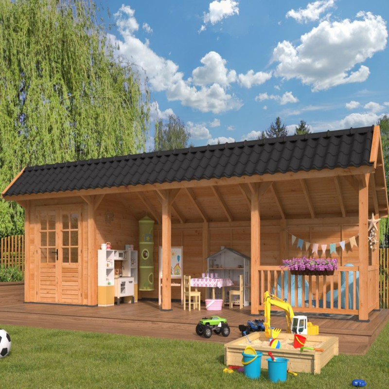 Přístřešek Bergen 11 L je delší verzí stavebnicových zahradních přístřešků s nesymetrickou sedlovou střechou Bergen. Vnější rozměry přístřešku jsou 888 x 306 cm. V levé části přístřešku je postaven domek s vnitřními rozměry 198 x 198 cm. Vchází se do něj velkými dvoukřídlými dveřmi, která jsou prosklené a díky tomu dovnitř vpouští dostatek světla. Dveře jsou z neimpregnovaného smrku a skla jsou vyztužena dřevěnými latěmi. Na střechu jsou použity rýgle o průřezu 12 x 4,5 cm, které jsou dostatečně pevné i pro těžší střešní krytiny. Zezadu je přístřešek zastavěn zdí, která vás ochrání před nepříjemným foukáním a v pravém rohu přístřešku je navíc elegantní plůtek, který celkový dojem z přístřešku ještě vylepší.