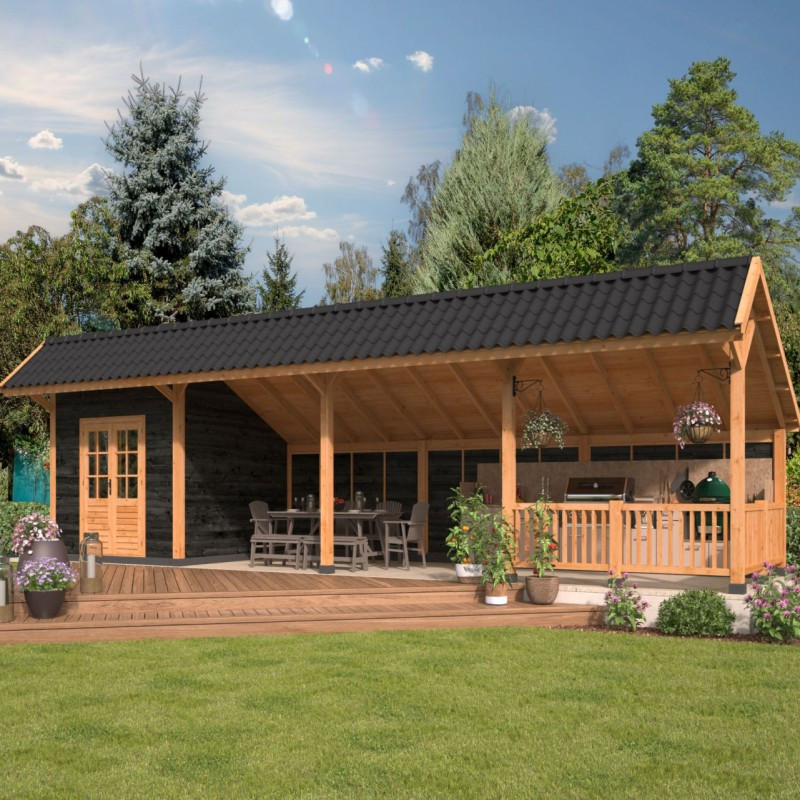 Přístřešek Bergen 11 XL je delší verzí stavebnicových zahradních přístřešků s nesymetrickou sedlovou střechou Bergen. Vnější rozměry přístřešku jsou 1302 x 452 cm. V levé části přístřešku je postaven domek s vnitřními rozměry 298 x 298 cm. Vchází se do něj velkými dvoukřídlými dveřmi, která jsou prosklené a díky tomu dovnitř vpouští dostatek světla. Dveře jsou z neimpregnovaného smrku a skla jsou vyztužena dřevěnými latěmi. Na střechu jsou použity rýgle o průřezu 14,5 x 4,5 cm, které jsou dostatečně pevné i pro těžší střešní krytiny. Zezadu je přístřešek zastavěn zdí, která vás ochrání před nepříjemným foukáním a v pravém rohu přístřešku je navíc elegantní plůtek, který celkový dojem z přístřešku ještě vylepší.