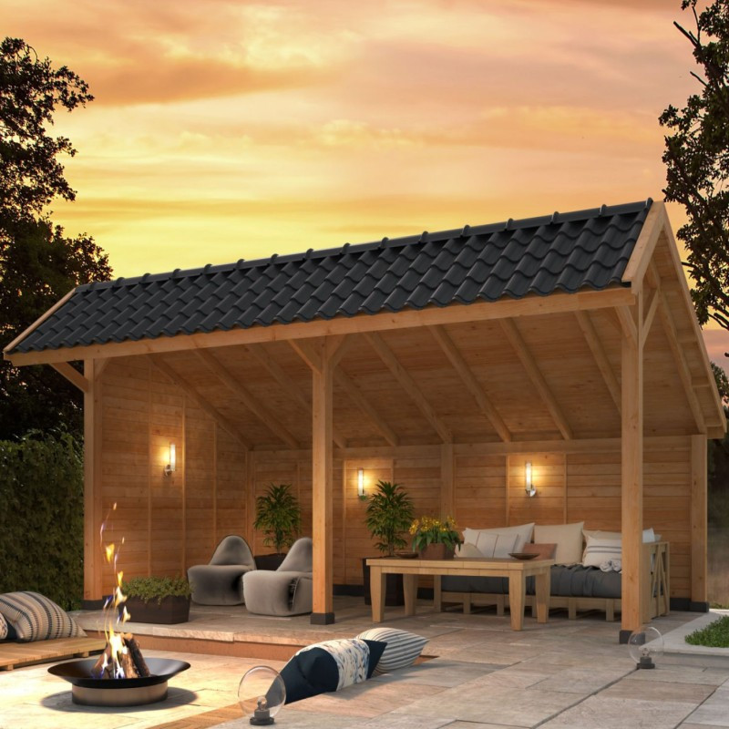 Přístřešek Bergen 2 XL je modulem stavebnicových zahradních přístřešků s nesymetrickou sedlovou střechou Bergen, který má ze dvou stran stěny, které vás bezpečně ochrání před silným větrem i deštěm. Vnější rozměry přístřešku jsou 677 x 452 cm. Vnitřní prostor přístřešku je vytyčen sloupy z modřínu o čtvercovém průřezu 14,5 x 14,5 cm a má rozměry 640 x 298 cm. Na střechu jsou použity rýgle o průřezu 14,5 x 4,5 cm, které jsou dostatečně pevné i pro těžší střešní krytiny.