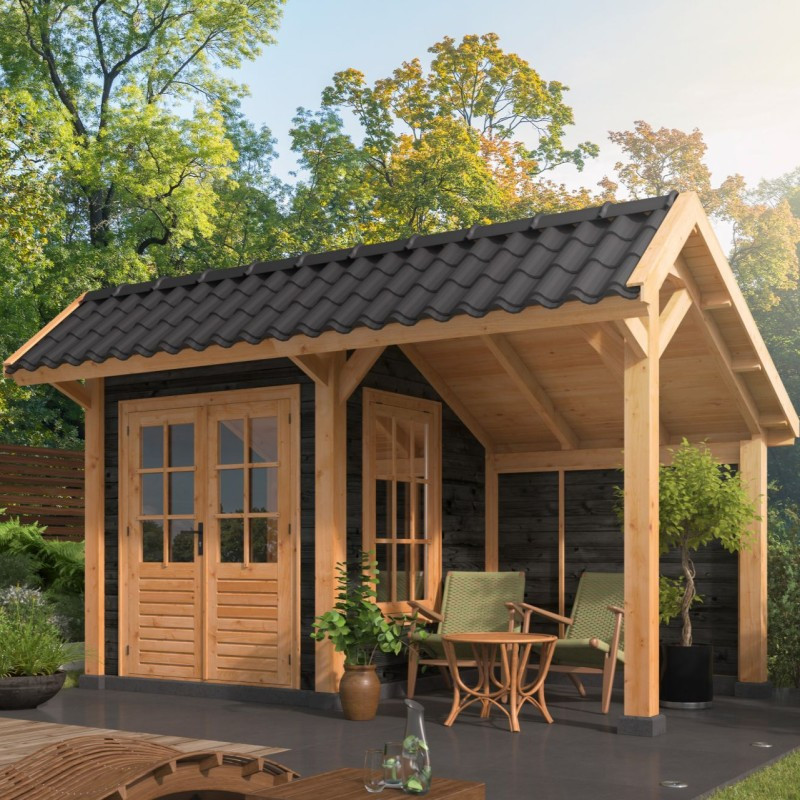 Přístřešek Bergen 3 L je úprava zahradního přístřešků s nesymetrickou sedlovou střechou Bergen. Vnější rozměry přístřešku jsou 468 x 306 cm. Vnitřní prostor přístřešku je vytyčen sloupy z modřínu o čtvercovém průřezu 12 x 12 cm a má rozměry 432 x 222 cm. Na střechu jsou použity rýgle o průřezu 12 x 4,5 cm, které jsou dostatečně pevné i pro těžší střešní krytiny. Bergen typ 3 má v jedné části vytvořený domek, do kterého si můžete například uklidit gril či zahradní nábytek na zimu. Do domku vedou velké, dvojité, prosklené dveře, které jsou opatřeny zámkem a klikou, takže vaše věci budou v bezpečí. Navíc z jedné strany domku je zabudované okno, které dovnitř vpustí dostatek světla. Dveře a okna jsou vyrobeny ze smrkového neimpregnovaného dřeva.