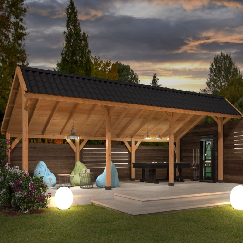 Přístřešek Berger 5 XL je delší verzí základního stavebního kamene stavebnicových zahradních přístřešků s nesymetrickou sedlovou střechou Bergen. Vnější rozměry přístřešku jsou 952 x 452 cm. Vnitřní prostor přístřešku je vytyčen sloupy z modřínu o čtvercovém průřezu 14,5 x 14,5 cm a má rozměry 952 x 327 cm. Na střechu jsou použity rýgle o průřezu 14,5 x 4,5 cm, které jsou dostatečně pevné i pro těžší střešní krytiny.