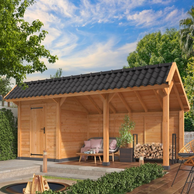 Přístřešek Berger 7 L je úprava zahradního přístřešků s nesymetrickou sedlovou střechou Bergen. Vnější rozměry přístřešku jsou 678 x 306 cm. Vnitřní prostor přístřešku je vytyčen sloupy z modřínu o čtvercovém průřezu 12 x 12 cm a má rozměry 198 + 396 cm. Na střechu jsou použity rýgle o průřezu 12 x 4,5 cm, které jsou dostatečně pevné i pro těžší střešní krytiny. Bergen typ 7 má v jedné části vytvořený domek, do kterého si můžete například uklidit gril či zahradní nábytek na zimu. Do domku vedou velké dvojité, prosklené dveře, které jsou opatřeny zámkem a klikou, takže vaše věci budou v bezpečí. Dveře jsou vyrobeny ze smrkového neimpregnovaného dřeva.