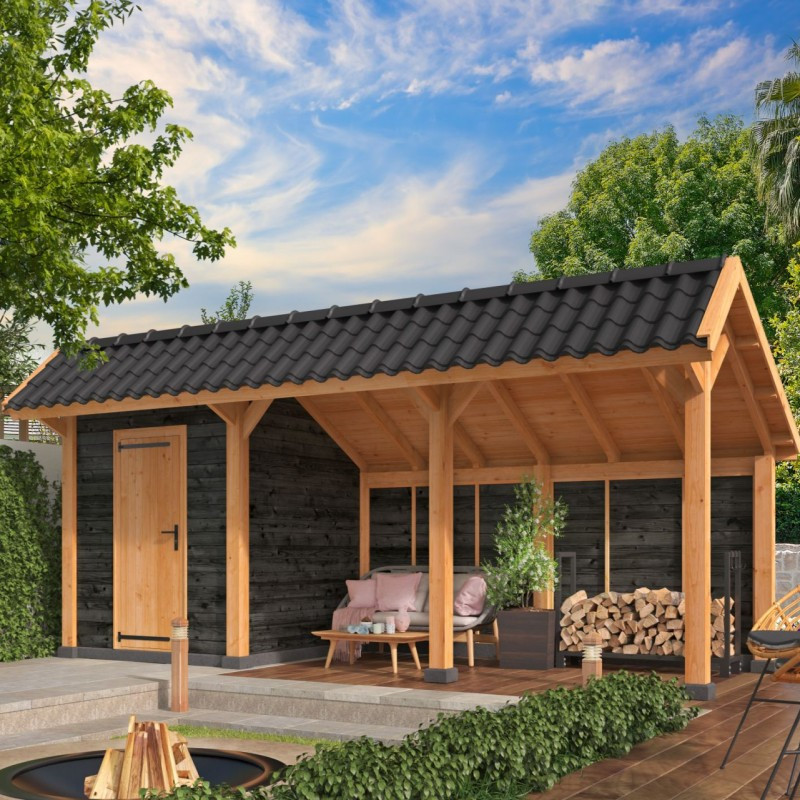 Přístřešek Bergen 7 L je úprava zahradního přístřešků s nesymetrickou sedlovou střechou Bergen. Vnější rozměry přístřešku jsou 678 x 306 cm. Vnitřní prostor přístřešku je vytyčen sloupy z modřínu o čtvercovém průřezu 12 x 12 cm a má rozměry 198 + 396 cm. Na střechu jsou použity rýgle o průřezu 12 x 4,5 cm, které jsou dostatečně pevné i pro těžší střešní krytiny. Bergen typ 7 má v jedné části vytvořený domek, do kterého si můžete například uklidit gril či zahradní nábytek na zimu. Do domku vedou velké dvojité, prosklené dveře, které jsou opatřeny zámkem a klikou, takže vaše věci budou v bezpečí. Dveře jsou vyrobeny ze smrkového neimpregnovaného dřeva.