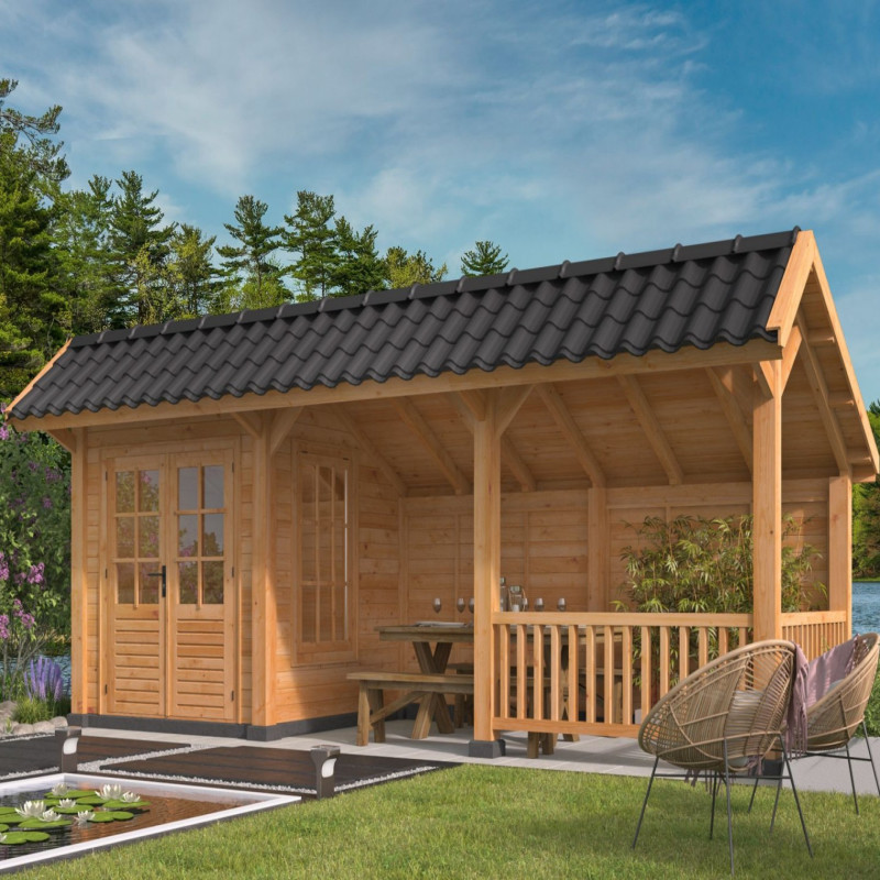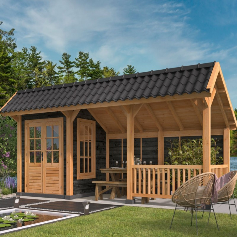 Přístřešek Bergen 8 L je delší verzí stavebnicových zahradních přístřešků s nesymetrickou sedlovou střechou Bergen. Vnější rozměry přístřešku jsou 678 x 306 cm. V levé části přístřešku je postaven domek s vnitřními rozměry 198 x 198 cm. Vchází se do něj velkými dvoukřídlými dveřmi, která jsou prosklené a společně s oknem na pravé stěně tak dovnitř vpouští dostatek světla. Dveře a okna jsou z neimpregnovaného smrku a skla jsou vyztužena dřevěnými latěmi. Na střechu jsou použity rýgle o průřezu 12 x 4,5 cm, které jsou dostatečně pevné i pro těžší střešní krytiny. Zezadu je přístřešek zastavěn zdí, která vás ochrání před nepříjemným foukáním a v pravém rohu přístřešku je navíc elegantní plůtek, který celkový dojem ještě vylepší.