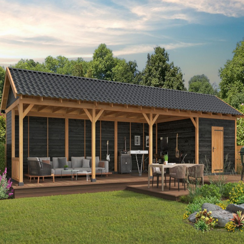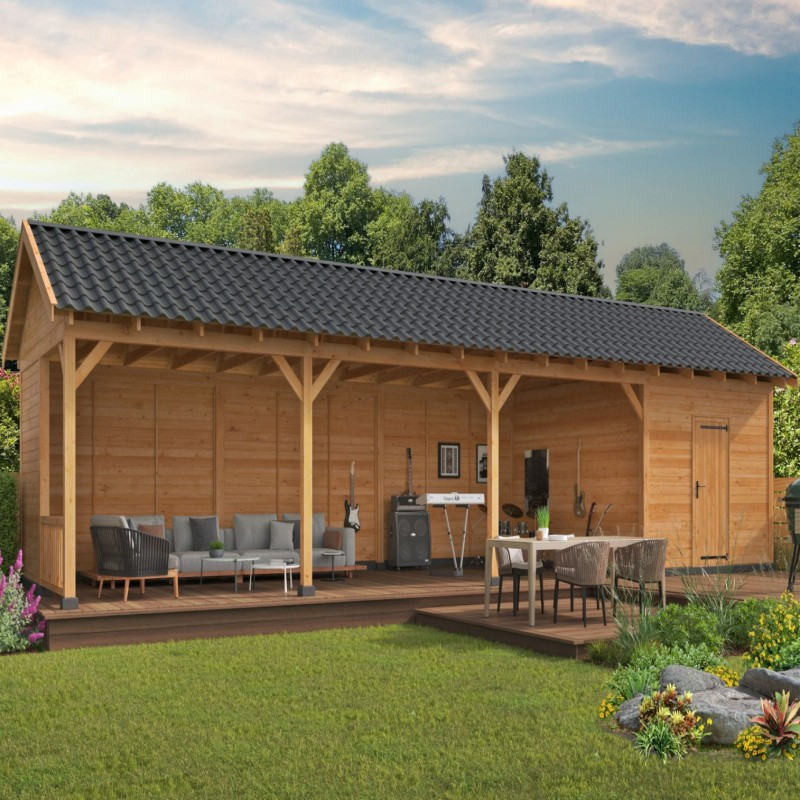 Přístřešek Hamar 10 XL je jedním z prodloužených typů stavebnicových zahradních přístřešků se sedlovou střechou. Tato pergola je tvořena základní sestavou přístřešku Hamar a navíc je k ní přistavěna místnost, stěny a elegantní plůtek, který ještě zlepší celkový vizuální dojem z přístřešku. Stěny skvěle zabrání větru a dešti. Do místnosti se vchází jednokřídlými dveřmi, které jsou z neimpregnovaného smrku. Vnější rozměry přístřešku jsou 1303 x 445 cm. Vnitřní prostor přístřešku je vytyčen sloupy z modřínu o čtvercovém průřezu 14,5 x 14,5 cm a má rozměry 1265 x 377 cm. Na střechu jsou použity rýgle o průřezu 14,5 x 4,5 cm, které jsou dostatečně pevné i pro těžší střešní krytiny. Zahradní altán je standardně dodáván bez střešní krytiny. Důvodem je fakt, že každý zákazník má jiné preference, ať už co se týče materiálu střešní krytiny, tak i barvy a dalších parametrů.