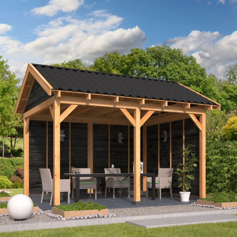 Chci individuální nabídkuPřístřešek Hamar 2 L je jedním z typů stavebnicových zahradních přístřešků se sedlovou střechou. Tato chata je tvořena základní sestavou přístřešku Hamar a navíc jsou k ní vestavěny stěny ze dvou stran, které skvěle zabrání větru a dešti. Vnější rozměry přístřešku jsou 478 x 395 cm. Vnitřní prostor přístřešku je vytyčen sloupy z modřínu o čtvercovém průřezu 14,5 x 14,5 cm a má rozměry 440 x 327 cm. Na střechu jsou použity rýgle o průřezu 14,5 x 4,5 cm, které jsou dostatečně pevné i pro těžší střešní krytiny. Zahradní chata je standardně dodáván bez střešní krytiny. Důvodem je fakt, že každý zákazník má jiné preference, ať už co se týče materiálu střešní krytiny, tak i barvy a dalších parametrů.