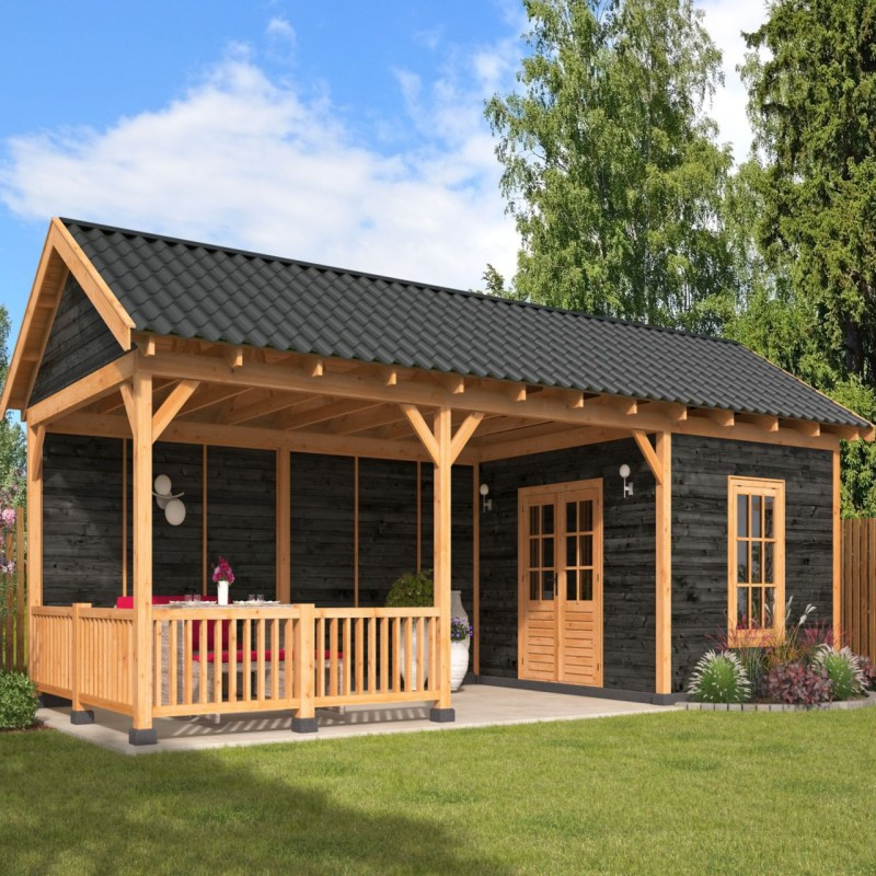 Přístřešek Hamar 7 XL je jedním z prodloužených typů stavebnicových zahradních přístřešků se sedlovou střechou. Tato chata je tvořena základní sestavou přístřešku Hamar a navíc je k ní přistavěna místnost, stěny a elegantní plůtek, která ještě zlepší celkový vizuální dojem z přístřešku. Stěny skvěle zabrání větru a dešti. Do místnosti se vchází dvoukřídlými dveřmi, které jsou prosklené a společně s oknem vpravo tak vpouští dovnitř dostatek světla. Okno a dveře jsou z neimpregnovaného smrku a skla jsou vyztužena dřevěnými latěmi. Vnější rozměry přístřešku jsou 990 x 445 cm. Vnitřní prostor přístřešku je vytyčen sloupy z modřínu o čtvercovém průřezu 14,5 x 14,5 cm a má rozměry 952 x 377 cm. Na střechu jsou použity rýgle o průřezu 14,5 x 4,5 cm, které jsou dostatečně pevné i pro těžší střešní krytiny. Zahradní přístřešek je standardně dodáván bez střešní krytiny. Důvodem je fakt, že každý zákazník má jiné preference, ať už co se týče materiálu střešní krytiny, tak i barvy a dalších parametrů.