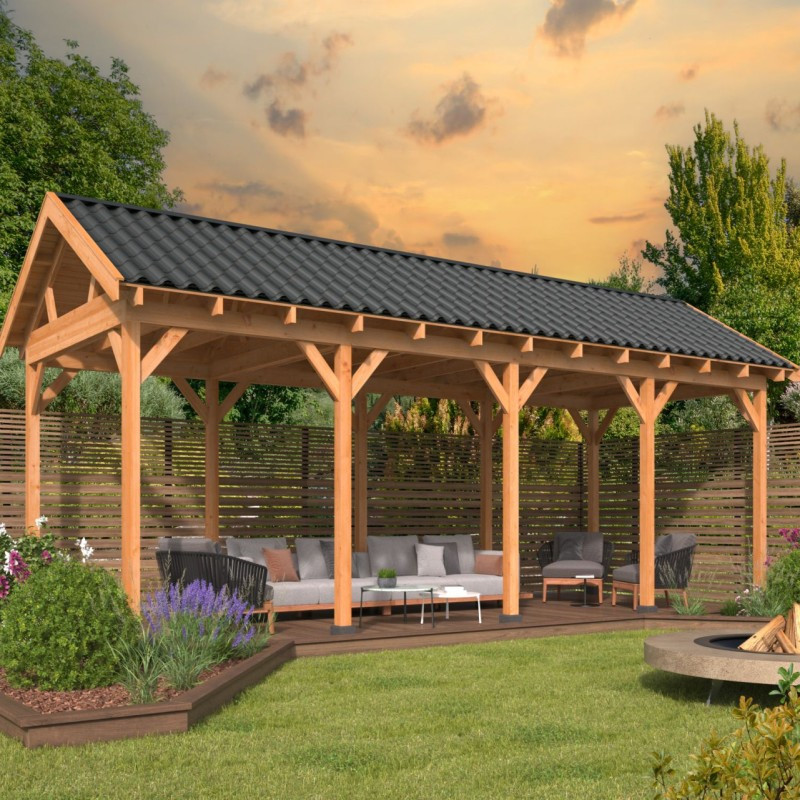 Přístřešek Hamar 9 L je prodloužený model základního stavebního kamene stavebnicových zahradních přístřešků se sedlovou střechou. Vnější rozměry přístřešku jsou 903 x 395 cm. Vnitřní prostor přístřešku je vytyčen sloupy z modřínu o čtvercovém průřezu 14,5 x 14,5 cm a má rozměry 865 x 327 cm. Na střechu jsou použity rýgle o průřezu 14,5 x 4,5 cm, které jsou dostatečně pevné i pro těžší střešní krytiny. Zahradní altán je standardně dodáván bez střešní krytiny. Důvodem je fakt, že každý zákazník má jiné preference, ať už co se týče materiálu střešní krytiny, tak i barvy a dalších parametrů.