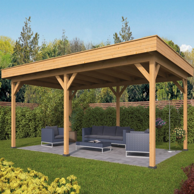 Přístřešek Oslo 1 XL je základní stavební kámen stavebnicových zahradních přístřešků s rovnou střechou. Vnější rozměry přístřešku jsou 678 x 430 cm. Vnitřní prostor přístřešku je vytyčen sloupy z modřínu o čtvercovém průřezu 14,5 x 14,5 cm a má rozměry 640 x 377 cm. Na střechu jsou použity rýgle o průřezu 14,5 x 4,5 cm, které jsou dostatečně pevné i pro těžší střešní krytiny. Přístřešek je dodáván se střešní krytinou, takže se nemusíte bát, že by vám kapala voda za krk.