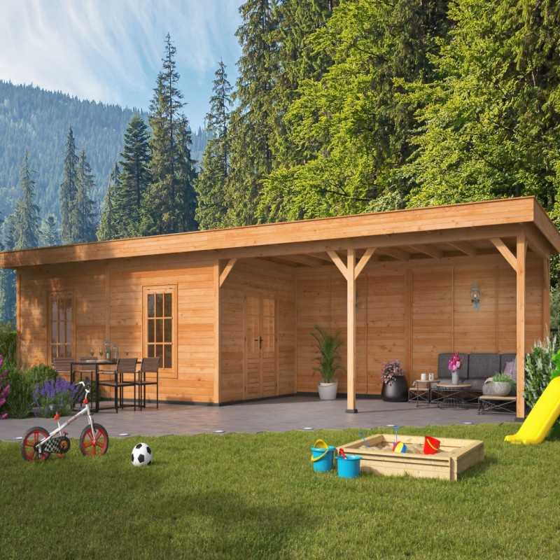 Přístřešek Oslo 11 XL je prodloužená verze základních stavebnicových zahradních přístřešků s rovnou střechou. K přístřešku je přistavěna prostorná místnost o rozměrech 348 x 596 cm. Vchází se do ní dvoukřídlými dveřmi, které jsou prosklené a společně se dvěma okny na levé stěně tak dovnitř vpouští dostatek světla. Okna a dveře jsou z neimpregnovaného smrku a skla jsou vyztužena dřevěnými latěmi. Místnost skvěle poslouží na uložení jakýkoliv věcí. Na opačné straně je stěna doplněna o elegantní plůtek. Vnější rozměry přístřešku jsou 1303 x 438 cm. Vnitřní prostor přístřešku je vytyčen sloupy z modřínu o čtvercovém průřezu 14,5 x 14,5 cm a má rozměry 1265 x 430 cm. Na střechu jsou použity rýgle o průřezu 14,5 x 4,5 cm, které jsou dostatečně pevné i pro těžký napadaný sníh, což bývá u rovných střech problém. Přístřešek je dodáván se střešní krytinou, takže se nemusíte bát, že by vám kapala voda za krk.