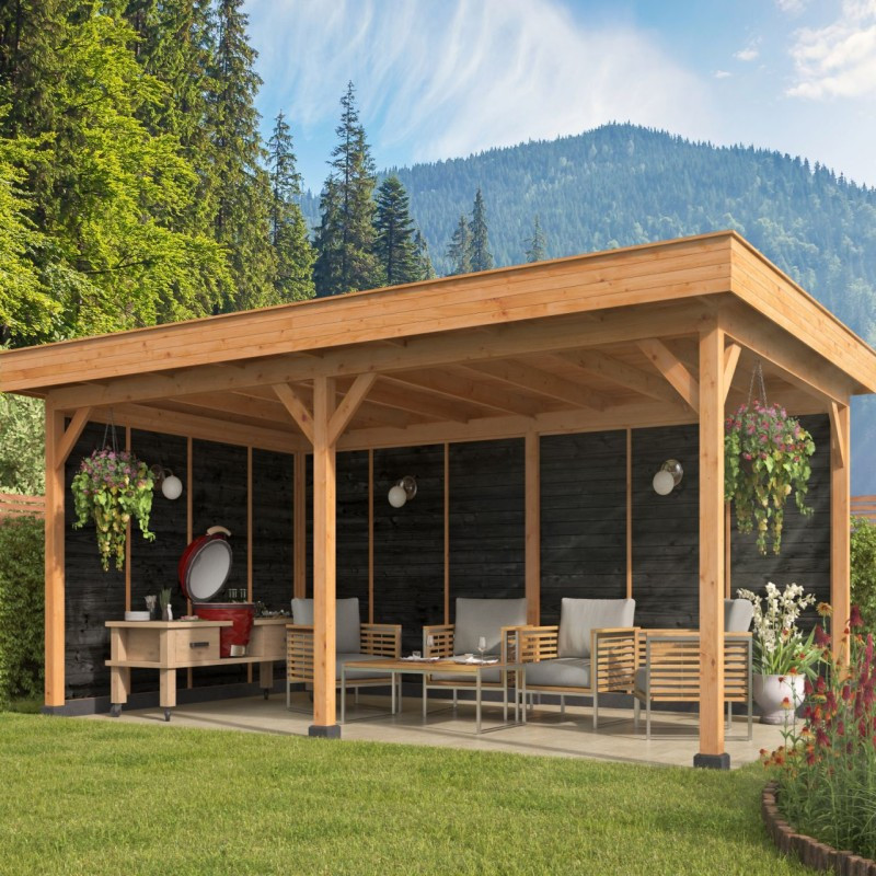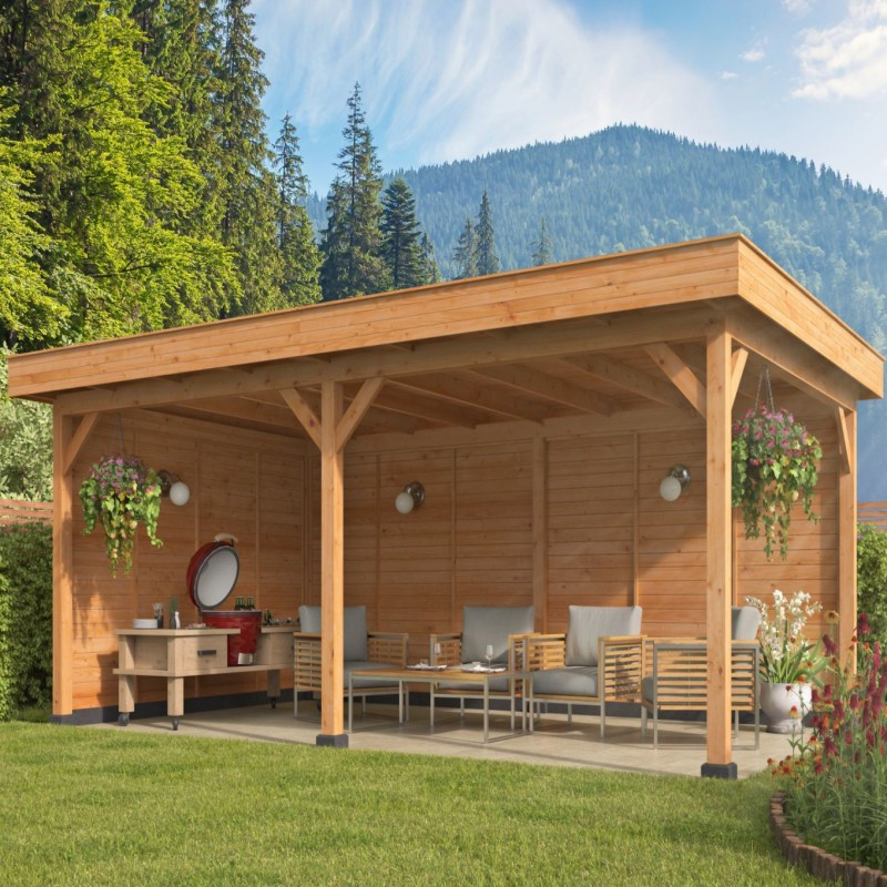 Přístřešek Oslo 2 XL je jedním z typů stavebnicových zahradních přístřešků s rovnou střechou. Vnější rozměry přístřešku jsou 678 x 430 cm. Vnitřní prostor přístřešku je vytyčen sloupy z modřínu o čtvercovém průřezu 14,5 x 14,5 cm a má rozměry 640 x 377 cm. K přístřešku jsou přistavěny dvě stěny, které zabrání větru. Na střechu jsou použity rýgle o průřezu 14,5 x 4,5 cm, které jsou dostatečně pevné i pro těžký napadaný sníh, což bývá někdy u rovných střech problém. Přístřešek je dodáván se střešní krytinou, takže se nemusíte bát, že by vám kapala voda za krk.