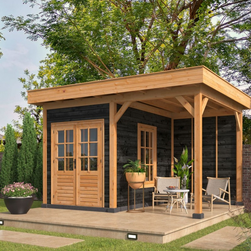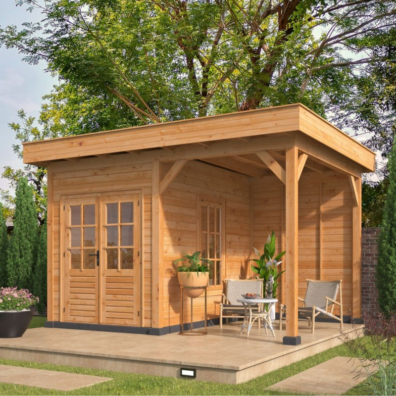 Montovaná chata Oslo 4 L je jedním z typů stavebnicových zahradních přístřešků s rovnou střechou. Vnější rozměry přístřešku jsou 478 x 380 cm. Vnitřní prostor přístřešku je vytyčen sloupy z modřínu o čtvercovém průřezu 14,5 x 14,5 cm a má rozměry 440 x 327 cm. V levé části přístřešku je postaven domek s vnitřními rozměry 198 x 298 cm. Vchází se do něj velkými dvoukřídlými dveřmi, které jsou prosklené a společně s oknem na pravé stěně tak dovnitř vpouští dostatek světla. Okno a dveře jsou z neimpregnovaného smrku a skla jsou vyztužena dřevěnými latěmi. K přístřešku je přistavěna stěna, která zabrání větru. Na střechu jsou použity rýgle o průřezu 14,5 x 4,5 cm, které jsou dostatečně pevné i pro těžký napadaný sníh, což bývá někdy u rovných střech problém. Přístřešek je dodáván se střešní krytinou, takže se nemusíte bát, že by vám kapala voda za krk.