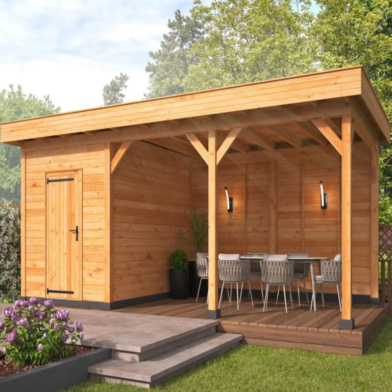 Přístřešek Oslo 7 L je prodloužená verze základních stavebnicových zahradních přístřešků s rovnou střechou. K tomuto typu je přistavěna jedna místnost, do níž se vchází celo-dřevěnými dveřmi. Prostor může sloužit například jako místo pro Vaše zahradní nářadí či gril. Vnější rozměry přístřešku jsou 690 x 380 cm. Vnitřní prostor přístřešku je vytyčen sloupy z modřínu o čtvercovém průřezu 14,5 x 14,5 cm a má rozměry 652 x 337 cm. Na střechu jsou použity rýgle o průřezu 14,5 x 4,5 cm, které jsou dostatečně pevné i pro těžký napadaný sníh, což bývá u rovných střech problém. Přístřešek je dodáván se střešní krytinou, takže se nemusíte bát, že by vám kapala voda za krk.