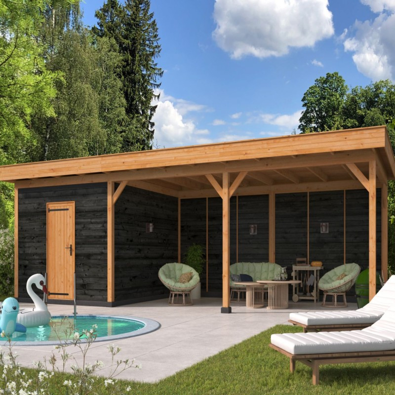 Přístřešek Oslo 7 XL je prodloužená verze základních stavebnicových zahradních přístřešků s rovnou střechou. K tomuto typu je přistavěna jedna místnost, do níž se vchází celo-dřevěnými dveřmi. Prostor může sloužit například jako místo pro Vaše zahradní nářadí či gril. Vnější rozměry přístřešku jsou 990 x 445 cm. Vnitřní prostor přístřešku je vytyčen sloupy z modřínu o čtvercovém průřezu 14,5 x 14,5 cm a má rozměry 952 x 377 cm. Dvě ze stran přístřešku jsou obehnány stěnami, aby jste si vychutnali pohodu pod pergolou například i při větru. Na střechu jsou použity rýgle o průřezu 14,5 x 4,5 cm, které jsou dostatečně pevné i pro těžký napadaný sníh, což bývá u rovných střech problém. Přístřešek je dodáván se střešní krytinou, takže se nemusíte bát, že by vám kapala voda za krk.