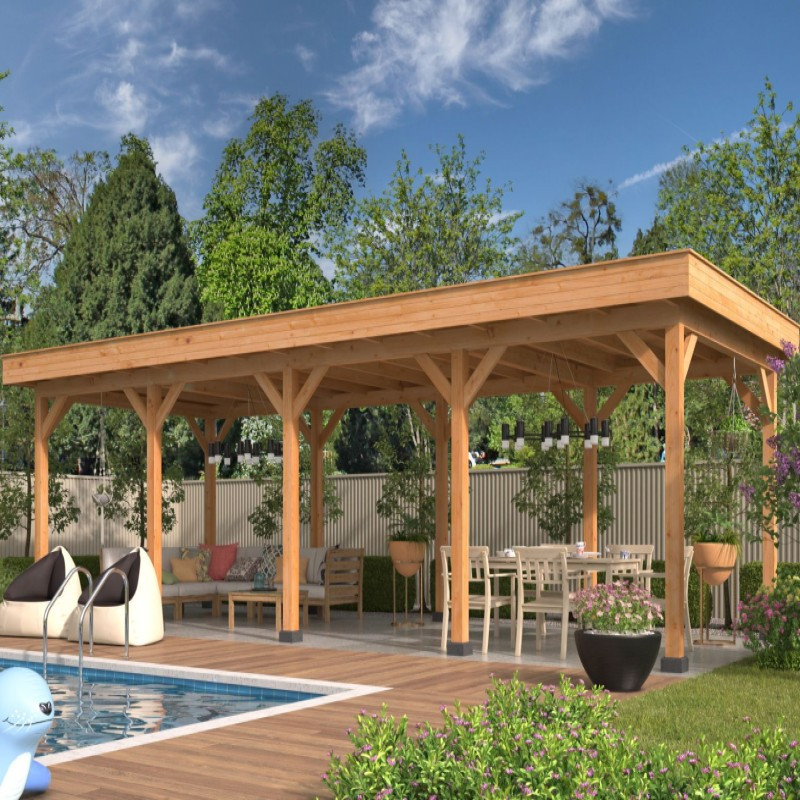 Přístřešek Oslo 9 L je kratší verze základních stavebnicových zahradních přístřešků s rovnou střechou. Vnější rozměry přístřešku jsou 895 x 371 cm. Vnitřní prostor přístřešku je vytyčen sloupy z modřínu o čtvercovém průřezu 14 x 14 cm a má rozměry 865 x 326cm. Na střechu jsou použity rýgle, které jsou dostatečně pevné i pro těžký napadaný sníh, což bývá u rovných střech problém. Přístřešek je dodáván se střešní krytinou, takže se nemusíte bát, že by vám kapala voda za krk.