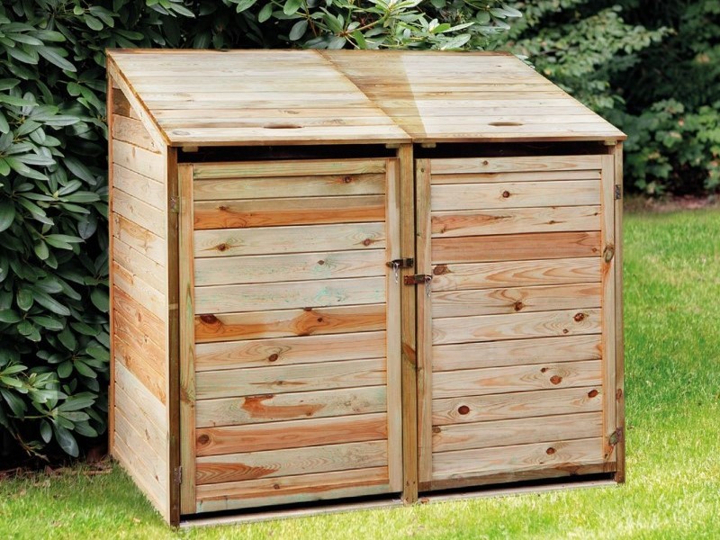 Přístřešek na popelnice má rozměry 140 x 85 cm a výšku 135 cm, což znamená, že se do tohoto "domečku" na popelnice vejdou dvě běžné popelnice o rozměrech 60 x 76 x 110 cm. Stěny přístřešku na popelnice tvoří 12 mm silné palubovky. Kryt na popelnice má odklápěcí víko a dvířka na západku. V ceně základního produktu je i spojovací materiál.