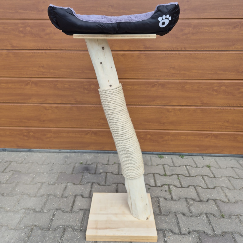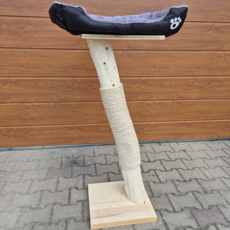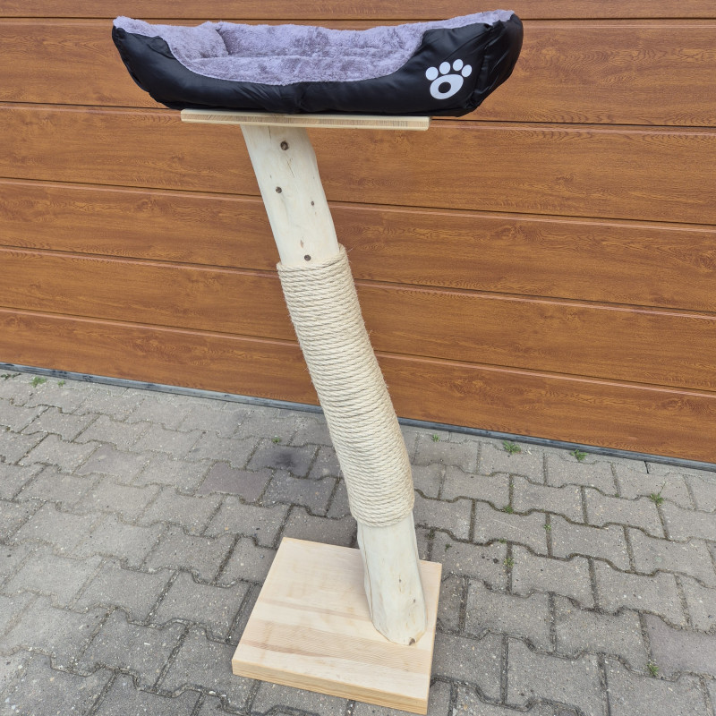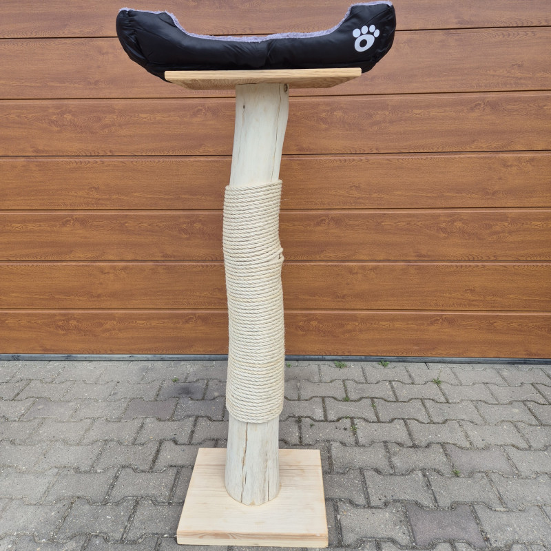 Základ škrabadla tvoří deska ze smrkového masivu, která zajistí stabilitu při používání i většími a aktivnějšími kočkami. Hlavní část tvoří kmen z listnatého stromu, zbavený kůry, ale bez povrchového ošetření jakoukoliv lazurou, pevně omotaný silným konopným lanem. To je ideální pro přirozené škrábání a pomáhá kočkám udržovat drápky v dobré kondici.