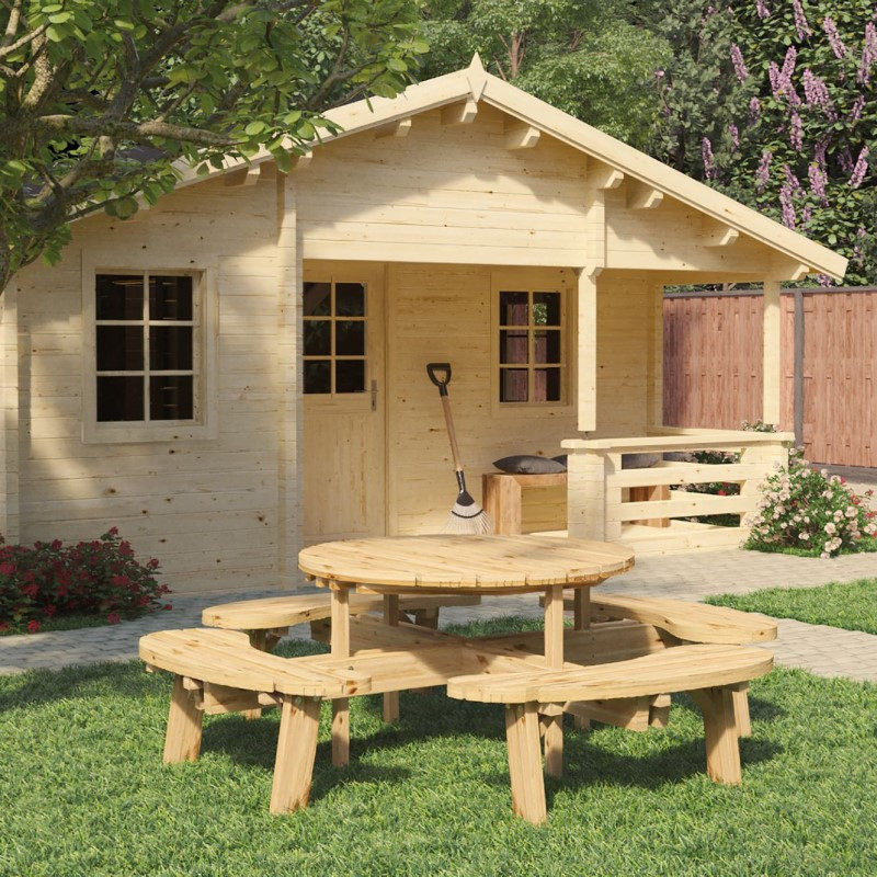Zahradní set je složen ze čtyř lavic pevně spojených s kulatým stolem o ø 119 cm. Průměr celého setu je pak 219 cm. Toto venkovní posezení je vyrobeno z hoblovaného smrkového dřeva. Z důvodu prodloužení trvanlivosti je vše ošetřeno hloubkovou impregnací. Tloušťka jídelní desky i sedáků je 4,5 cm a výška stolu je 73 cm. Set je vhodný pro maximálně 8 lidí. Součástí balení je spojovací materiál.