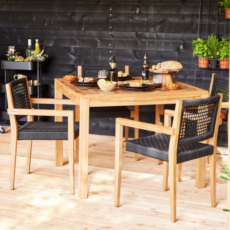Stoleček čtvercového tvaru na balkón nebo venkovní terasu pro dva lidi je vyroben z dohladka hoblovaného teakového dřeva, které je z důvodu prodloužení životnosti a udržení stolu v co nejlepším stavu natřeno speciálním ošetřujícím olejem na tvrdé dřevo. Tloušťka desky jsou 4 cm. Šířka použitých prken se liší podle velikosti stolu, což dává každému stolu jedinečný charakter. Tento stůl má rozměry 100 x 100 centimetrů a výšku 75 cm. Styl tohoto nábytku je velice moderní a hodí se na každou terasu.