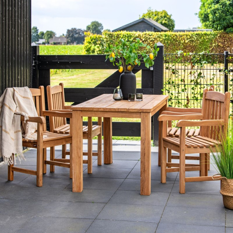 Stůl na venkovní terasu obdélníkového tvaru je vyroben z dohladka hoblovaného teakového dřeva, které je z důvodu prodloužení životnosti a udržení stolu v co nejlepším stavu natřeno speciálním ošetřujícím olejem na tvrdé dřevo. Rustikální vzhled stolu znamená, že stůl vypadá staromódně.