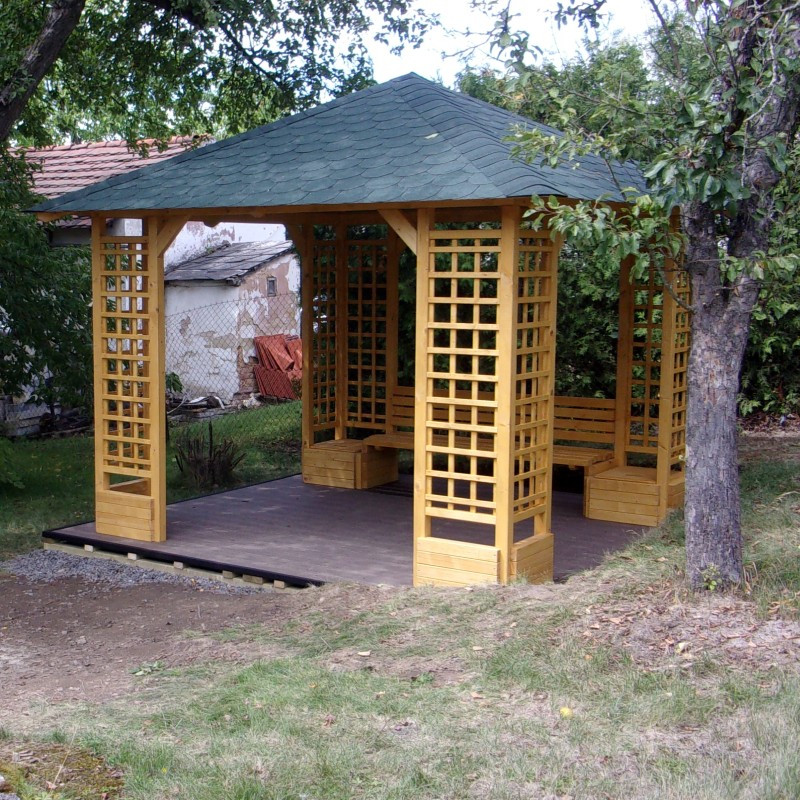 Chci individuální nabídkuZahradní altán VL 48 je jako stvořený pro klidné lenošení o samotě, nebo pro posezení s přáteli apod. Altánek vyrábíme z hoblovaného smrkového dřeva truhlářské kvality a v základním provedení jej dodáváme bez povrchové úpravy, v krásné přírodní barvě masivního dřeva. Altán je možné doplnit o další dřevěné mříže nebo neprůhledné výplně boku altánu. V každém rohu altánu se nachází květinové truhlíky bez dna s mřížemi pro popínavé rostliny a uvnitř altánu je vestavěna jedna lavička o délce 180 cm.