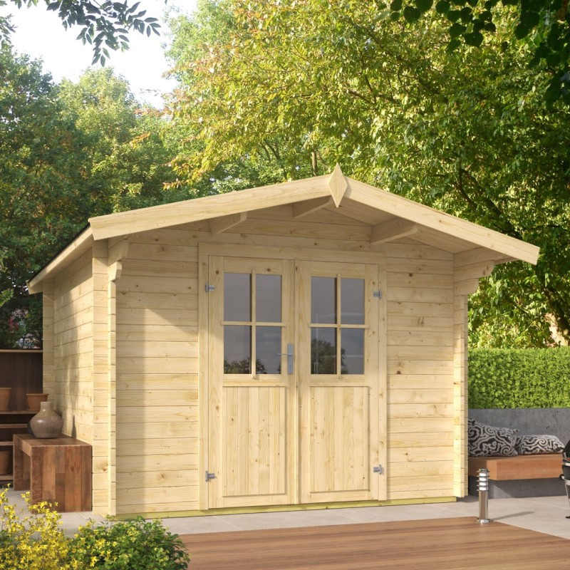 Chci individuální nabídkuZahradní chatka Albacete je menší dřevostavba o vnějších rozměrech 300 x 370 cm. Její užitná plocha je 7,6 m2 a rozměry základů jsou 282 x 282 cm. Chata má klasickou sedlovou střechu, která přesahuje přes vchodové dveře o 70 cm. Dveře jsou dvoukřídlé široké 164 cm a jejich výška je 190 cm. Dveře jsou částečně prosklené jednoduchým sklem silným 4 mm. Zasklení je vyztuženo dřevěnými latěmi. Nejvyšší bod chatky od země je ve výšce 236 cm.