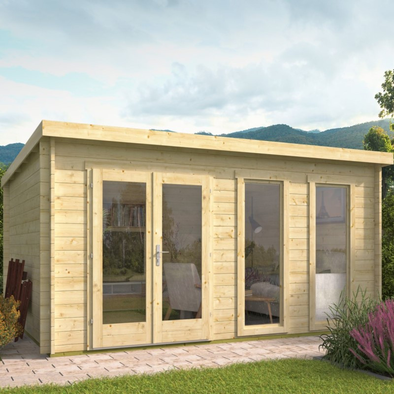 Chci individuální nabídkuZahradní chata Annabel je větší chata o vnějších rozměrech 500 x 400 cm. Její užitná plocha je 18,2 m2 a rozměry základů jsou 480 x 380 cm. Chata má plochou střechu, která má identický přesah po obvodu. Dveře jsou dvoukřídlé široké 161 cm a jejich výška je 190 cm. Nejvyšší bod chaty je od země ve výšce 223 cm. Na straně vedle dveří jsou vedle sebe dvě identická okna. Každé okno má rozměry 72 x 184 cm a je zaskleno izolačním dvojsklem 3 - 6 - 3 mm (sklo - vzduch - sklo).