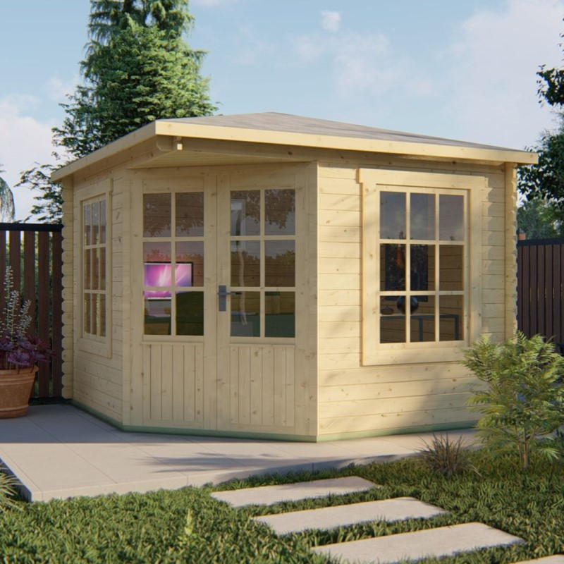 Chci individuální nabídkuZahradní altán Asmund je menší zahradní altán s užitnou plochou 7 m2. Vnější rozměry altánu jsou 300 x 300 cm, rozměry základů altánu jsou pak 280 x 280 cm. Altán má ve špičce výšku 250 cm. Altán má dvě stěny plné a dvě stěny s okny o rozměru 86 x 122 cm. Vstup je v jednom z rohů altánu, tvoří ho částečně prosklené dvoukřídlé dveře o šířce 142 cm. Výplně jsou zaskleny 4 mm silným jednovrstvým sklem. Okna jsou vyztužena dřevěnými latěmi a jsou otevíratelná.