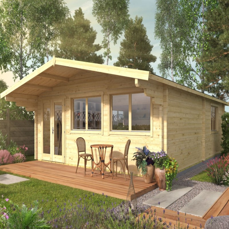 Chci individuální nabídkuZahradní chata Ballyragget je větší chata o vnějších rozměrech 930 x 595 cm. Její užitná plocha je 44,9 m2 a rozměry základů jsou 575 x 780 cm. Chata má klasickou sedlovou střechu, která přesahuje přes vchodové dveře o 130 cm. Dveře jsou dvoukřídlé se šířkou145 cm a jejich výška je 195 cm. Nejvyšší bod chaty je od země ve výšce 277 cm. Na straně vedle dveří jsou dvě okna, každé s rozměrem 142 x 105 cm a je zaskleno izolačním dvojsklem o síle 3 - 9 - 3 mm (sklo - vzduch - sklo). Na každé straně v zadní části zahradní chaty je pak ještě jedno takové okno. Všechna okna jsou vyztužena dřevěnými latěmi a jsou otevíratelná.
