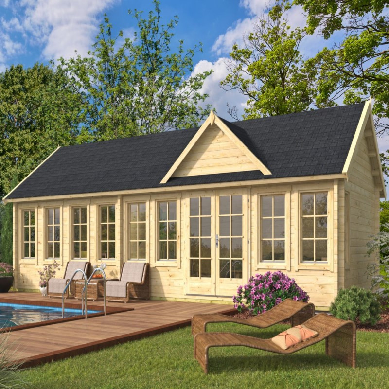 Chci individuální nabídkuZahradní chata Big Lauren je velká chata o vnějších rozměrech 400 x 930 cm. Vnitřní prostor je rozdělen dveřmi na 2 místnosti s užitkovým prostorem 18,8 m2 a 13,6 m2, rozměry základů jsou 380 x 910 cm. Chata má elegantní sedlovou střechu, a v nejvyšším místě dosahuje 351 cm. Dvoukřídlé dveře jsou široké 155 cm a jejich výška je 196 cm. Na levé straně od dveří je 6 oken a napravo od nich 2, přičemž z každého boku chaty je také jedno okno. Každé má rozměry 73 x 122 cm a lze jej otevřít. Okna jsou zasklena dvojvrstvým sklem o síle 4 - 14 - 4 mm (sklo - vzduch - sklo) a jsou vyztužena dřevěnými latěmi.