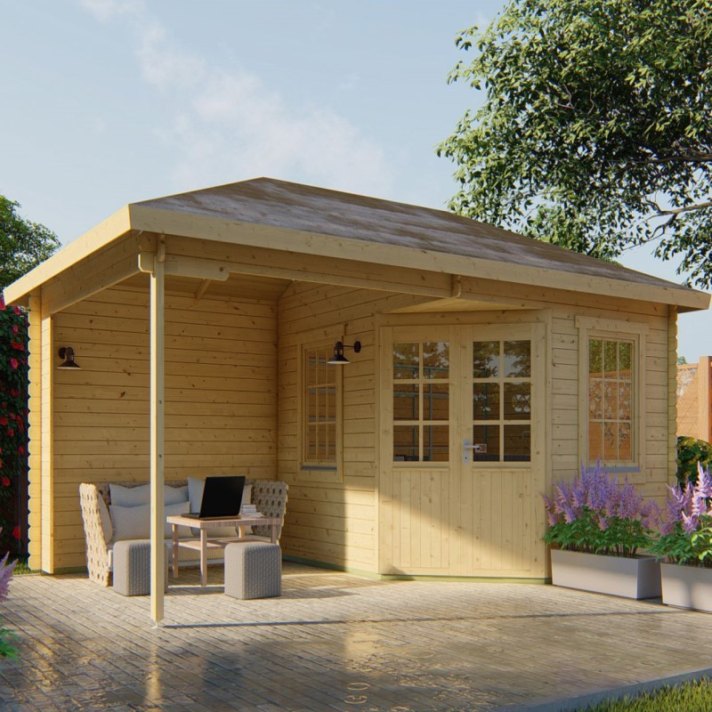 Chci individuální nabídkuZahradní chata Christoffer je středně velká chata o vnějších rozměrech 350 x 575 cm. Její užitná plocha je 9,6 m2 + 8,7 m2 terasa a rozměry základů jsou 555 x 330 cm. Chata má valbovou střechu s přesahem 26 cm. Dveře jsou široké 120 cm a jejich výška je 188 cm. Nejvyšší bod chaty je od země ve výšce 305 cm. Na každé straně vedle dveří je po jednom oknu. Každé okno má rozměry 77 x 112 cm a je zaskleno 4 mm silným jednovrstvým sklem. Okna jsou vyztužena dřevěnými latěmi a jsou otevíratelná. Terasa zahradní chaty je zastřešena a má rozměry 265 x 350 cm.