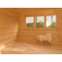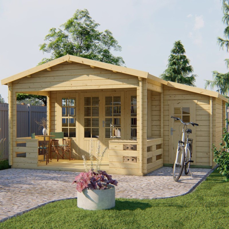 Chci individuální nabídkuZahradní chata Coventry je velká chata do L s přístavkem na nářadí o vnějších rozměrech 590 x 553 cm. Užitná plocha hlavní místnosti chaty je 13,4 m2, užitná plocha terasy je 9,2 m2 a plocha přístavku je 4,8 m2. Rozměry základů jsou 570 x 543 cm. Chata má klasickou sedlovou střechu, která přesahuje přes celou terasu i přístavek. Dveře jsou široké 159 cm a jejich výška je 194 cm, dveře do přístavku mají rozměry 68 x 162 cm. Nejvyšší bod chaty je od země ve výšce 263 cm. Na každé straně vedle dveří je po jednom oknu, další okno je v boční stěně chaty a jedno malé okno je umístěno ve dveřích do přístavku. Okna u kolem dveří mají rozměry 78 x 194 cm, okno v boční stěně má rozměry 213 x 96 cm a je otevíratelné. Okna jsou zasklena dvouvrstvým sklem o síle 4 - 6 - 4 mm (sklo - vzduch - sklo) a jsou vyztužena dřevěnými latěmi.